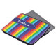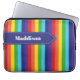 This bright rainbow striped pattern laptop sleeve has an indigo blue banner ribbon with white stitching detail across the top. It is personalized with a name or whatever text you want to add.