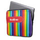 This bright rainbow striped pattern laptop sleeve has a red banner ribbon with white stitching detail across the top. It is personalized with a name or whatever text you want to add.