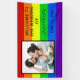 This bold rainbow striped Welcome to our Wedding sign features a custom romantic LGBTQ engagement photo for a gay or lesbian couple who loves bright and colorful striped announcement. Personalize this cheery LGBT banner with your names and date on the red, orange, yellow, green, blue, and purple stripes.