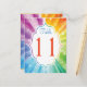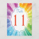 This fun and colorful rainbow colored sunburst stripes table number post card has bocca effect highlight circles and burst of star lights on it that matches the wedding invitation shown below. **You must change the number 11 to each of the table numbers you need, add it to your cart, and then return and repeat the process until you have all the individually numbered cards that you need in your cart. Stand it on a small easel, or in your centerpieces. If you need assistance, email niteowlstudio@gmail.com.