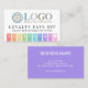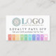 Loyalty pays off punch card printed with your logo and with rainbow stripes, a cute heart, and charming fonts. Add your business name and contact info on the other side in white on purple. A colorful and fun loyalty card with fields in rainbow colors from red to yellow to green to blue to purple to pink with a little heart and your logo. Loyalty card template you can personalize with logo, business name, and contact info.