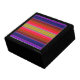This stylish gift box is decorated with a striped pattern in orange, purple, yellow, red, green, violet and black which resembles a rainbow. The pattern is set off by the black trim.
