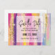 Save the date postcard with an abstract background design. Vibrant stripes in both bold and pastel colors. Pinks, blues, purples and yellow colors combined with faux gold sparkly glitter layered over top.