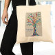 This decorative tote beg features a print of a rainbow colored tree on a pale gray background.
