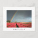 Postcard of a colorful rainbow in a dark sky over a windmill and a field full of bright red tulips during a spring storm in a landscape near Amsterdam in the Netherlands with a white border and the text: 'Amsterdam'.