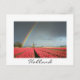 Postcard of a colorful rainbow in a dark sky over a windmill and a field full of bright red tulips during a spring storm in a landscape near Amsterdam in the Netherlands with a white border and the text: 'Holland'.