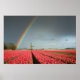 Poster print of a colorful rainbow in a dark sky over a windmill and a field full of bright red tulips during a spring storm in a landscape near Amsterdam in the Netherlands.