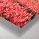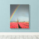 Vertical canvas landscape print of a colorful rainbow in a dark sky over a windmill and a field full of bright red tulips during a spring storm in a landscape near Amsterdam in the Netherlands.