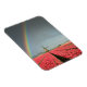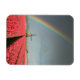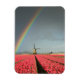 Vertical photo magnet with a colorful rainbow in a dark sky over a windmill and a field full of bright red tulips during a spring storm in a landscape near Amsterdam in the Netherlands.
