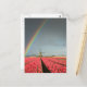 Vertical postcard of a colorful rainbow in a dark sky over a windmill and a field full of bright red tulips during a spring storm in a landscape near Amsterdam in the Netherlands.