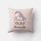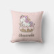Custom throw pillow featuring pastel rainbow unicorn cake personalized with your name in brush script typography.