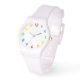 I only have one complaint. I ordered the watch with clear case and strap, and what was sent was white case and strap. I'm going to keep it because 1) it looks very nice in white, and 2) it would take too long to get a replacement made and sent in time for my occasion. Aside from the mix up with the color, the watch does look very good in white. The purple dial is actually sparkly which did not show in the online images. That was a nice surprise. If you like Swatch watches this is very similar to those. It's 33.6mm in diameter, 10.5mm thick, and 40.6mm lug to lug. Stainless steel case back says 3ATM/30m WR, so no swimming or showering or submerging this one. If you like Woodstock, this is a great choice.