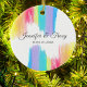 Beautiful watercolor rainbow Christmas ornament with pretty, artistic paint strokes full of bright color. These colorful cute keepsake gifts can be personalized with a couple's name and wedding date for favors or an anniversary gift.
