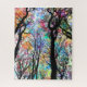 Bright vivid rainbow water color drop sky behind silhouette black trees. Beautiful sky, or maybe you see it as leaves in red, orange yellow green blue teal and purple. Bold original digital art. Looks good on size 16x20 and smaller. Design name is Magical Trees.