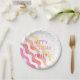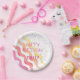 Rainbow Waves Stars Girly Birthday Party Paper Plate. Cute colorful birthday design with name and happy birthday wish, pink and yellow waves and stars. Personalize with your name.
