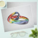 A striking digital image of two interlocked wedding rings made from the swirling colors of a rainbow pride flag. A perfect image to represent marriage equality.