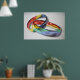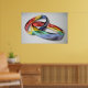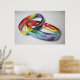 A striking digital image of two interlocked wedding rings made from the swirling colors of a rainbow pride flag. A perfect image to represent marriage equality.