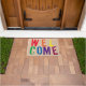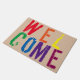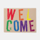 "WELCOME" printed in the colors of the rainbow, huge letters. Background has a fluffy filter, and the color can be modified to your liking.