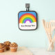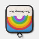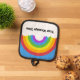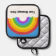 Add a name or your own clever slogan to create your own custom potholder. A fun classic rainbow graphic is set against a blue background with white clouds below. Your message is in black lettering against the white clouds.