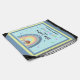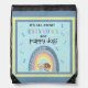 This adorable drawstring backpack bag has a modern rainbow with two whimsical puppy dogs standing under it. The top row of the rainbow has little puppy dog prints climbing up both sides leading to a heart on top. Typography reads It's all about Rainbows and Puppy Dogs. The letters in "Rainbows" are all done in different colors and there are different colored dog bones are scattered about. Background is a pale sky blue with a darker blue and yellow border. Toddlers, pre-teens, teenagers, college girls and puppy dog lovers alike will love this bag!