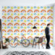 Rainbows, sunshine and clouds in yellow, blue and red colors cute patterned wallpaper.