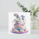 LOVELY RAINBOWS & UNICORNS KIDS BIRTHDAY LAYER CAKE ON THE FRONT OF THE CARD. COMPLETELY EDITABLE COPY ON THE BACK.