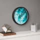 Wall clock in your choice of trim finishes including acrylic and wood, a variety of colors such as black, white, and natural wood. Clock may be ordered as round or square, in several sizes, and hands can be ordered as white or black. Artwork is of raindrops on a car windshield, in teal hues.