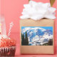 A view of Mount Rainier through a break in a grouping of pine trees.