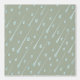 Large shiny raindrops pour down over an olive green background that has a vintage feel.