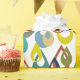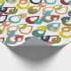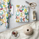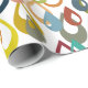 This wrapping paper has a mid-century modern design of raindrops with holes in retro colors repeated across the design on a field of white.