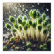 A serene painting of plant sprouts, each delicate shoot adorned with glistening raindrops. The soft, fresh greens of the young plants contrast beautifully with the shimmering droplets, evoking a sense of renewal and nature's gentle power. A perfect piece for bringing freshness and life to any space