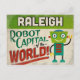 A funny Raleigh North Carolina vintage travel postcard featuring a friendly robot with fun retro style text that says, "Raleigh, Robot Capital of the world!"