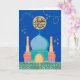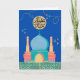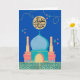 Eid Mubarak greetings for Ramadan. Mosque in shades of salmon, blue, teal, and tan colors. Customize the text inside as you like. Art, image, and verse copyright Shoaff Ballanger Studios, 2022.