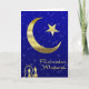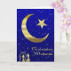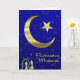 Ramadan card with golden mosque and spires, moon and star against dark blue starry background.