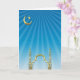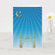 Ramadan card with golden mosque and spires, moon and star against blue starburst background.