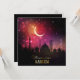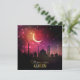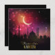 Silhouette for Ramadan with a mosque on a crescent moon with a pink and orange sunset and stars.