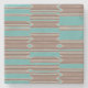 A rustic, western, mosaic design created from stripes in shades of brown that have been tiled, randomly shifted, and placed on a blue background. This digital image is customizable, including the background color and the direction of the stripes.