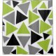 This modern shower curtain features an abstract geometric design of lime green, medium gray, and black triangles randomly arranged on a white background.