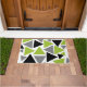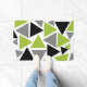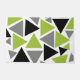 An abstract geometric design featuring lime green, medium gray, and black triangles randomly arranged on a white background.