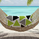 An abstract geometric design featuring lime green, medium gray, and black triangles randomly arranged on a white background. The perfect addition to your modern patio decor!