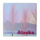 A digital painting of snow-covered birch trees; the snow tinged pink by the setting sun. Text reading "Alaska" also appears. Here in the north it is common to see snow covered trees tinged either pink or orange by the sun hanging low on the horizon.