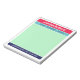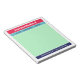 Colorblock notepad for back to school with a note from mom of [your children's names] at the top and your name and phone number at the bottom in a combination of a retro script and a timeless sans serif font with colorblocks of raspberry red, turquoise, mint green, and navy blue for a colorful and eye-catching yet tasteful look. Circle the name of the child your note regards to by hand. Jot down your message on the mint green background.