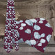 A raspberry, burgundy red wedding tie featuring dusty blue eucalyptus.