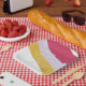 This template design features raspberry, violet, and honey color streams diagonal flows matching the invitation design. Personalize template fields, remove text or edit using the design tool to select a font style, size, and color you prefer.
