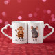 Celebrate romantic compatibility with these enchanting lovers' mugs, which feature whimsical depictions of the Rat and the Monkey, the first and ninth signs/animals respectively in the Eastern zodiac. Personalize with names or initials!