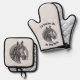 "I'd Rather Be At The Barn" is the sentiment that accompanies this oven mitt and pot holder set. A large dark horse with a long mane pokes his head through a horseshoe in the center of this mitt. Curved above and below this black and white etching is the text which can easily be customized if you desire.