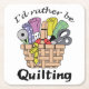 Quilting basket holding fabric and tools with "I'd rather be quilting"