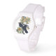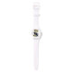 I only have one complaint. I ordered the watch with clear case and strap, and what was sent was white case and strap. I'm going to keep it because 1) it looks very nice in white, and 2) it would take too long to get a replacement made and sent in time for my occasion. Aside from the mix up with the color, the watch does look very good in white. The purple dial is actually sparkly which did not show in the online images. That was a nice surprise. If you like Swatch watches this is very similar to those. It's 33.6mm in diameter, 10.5mm thick, and 40.6mm lug to lug. Stainless steel case back says 3ATM/30m WR, so no swimming or showering or submerging this one. If you like Woodstock, this is a great choice.