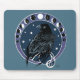 Tribal raven sitting in a circle of stars and moon phases all drawn in an art nouveau style in a backdrop of blues and purple.