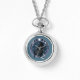 A raven sitting in a circle of stars and phases of the moon all drawn Ian an art nouveau style in a backdrop of blues and purples.